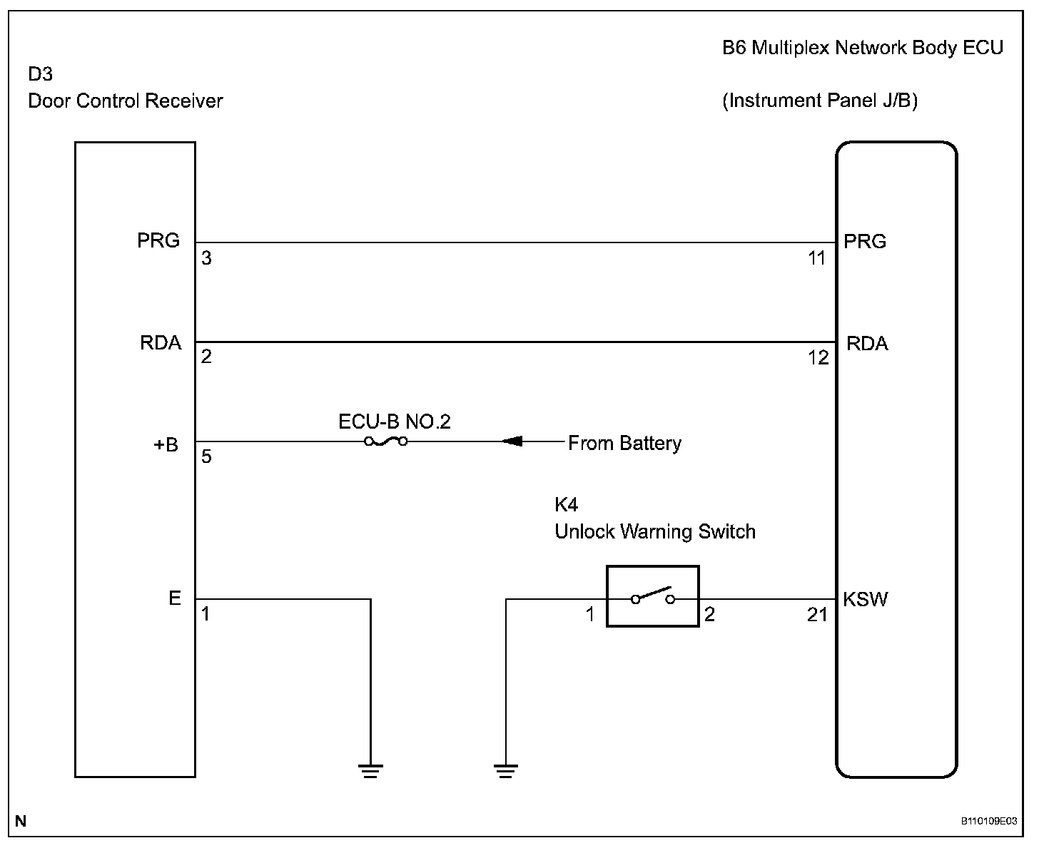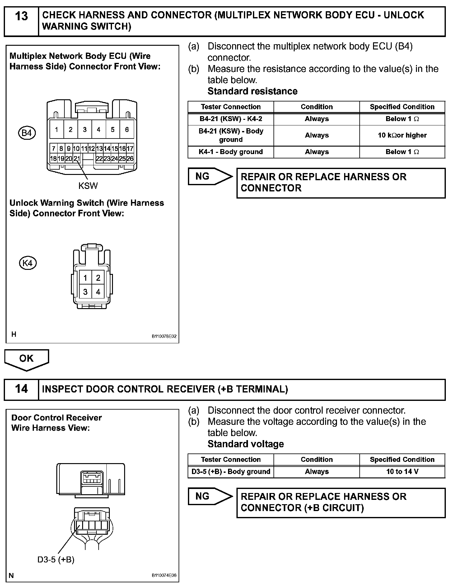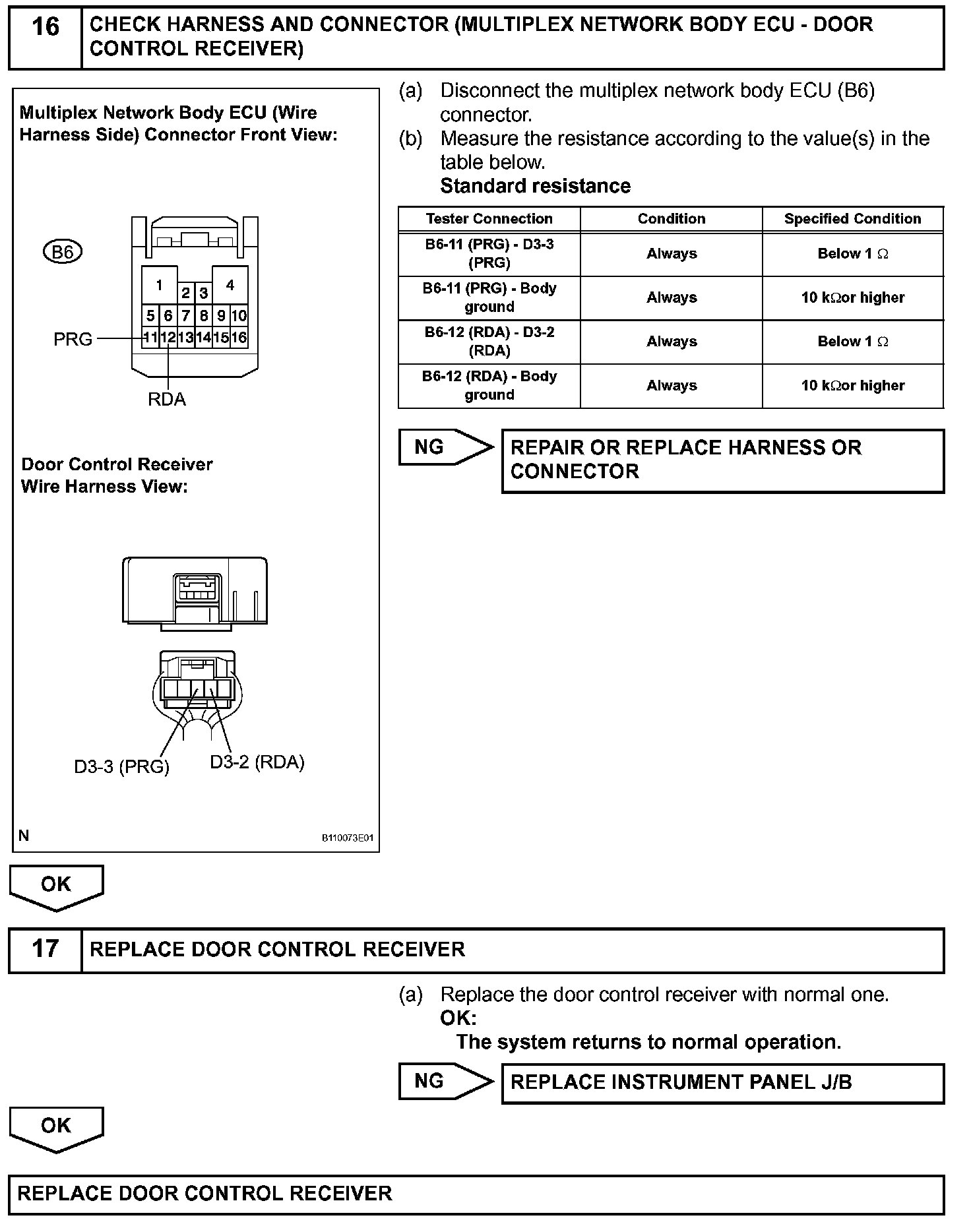 The door control receiver receives a signal from the transmitter and sends this signal to the multiplex network body ECU. The multiplex network body ECU then controls operation of the door locks, power windows and sliding roof. The power back door ECU also causes the power back door to open or close when it receives a signal from the transmitter via the door control receiver and multiplex network body ECU.