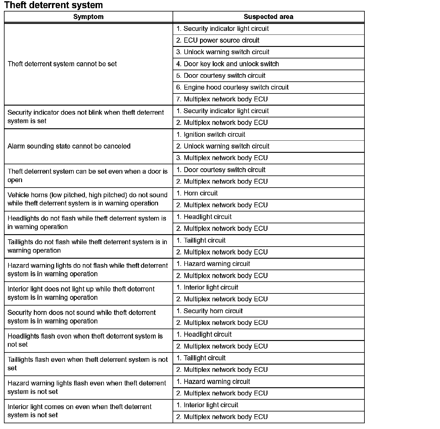 Problem Symptoms Table - Theft Deterrent System:
