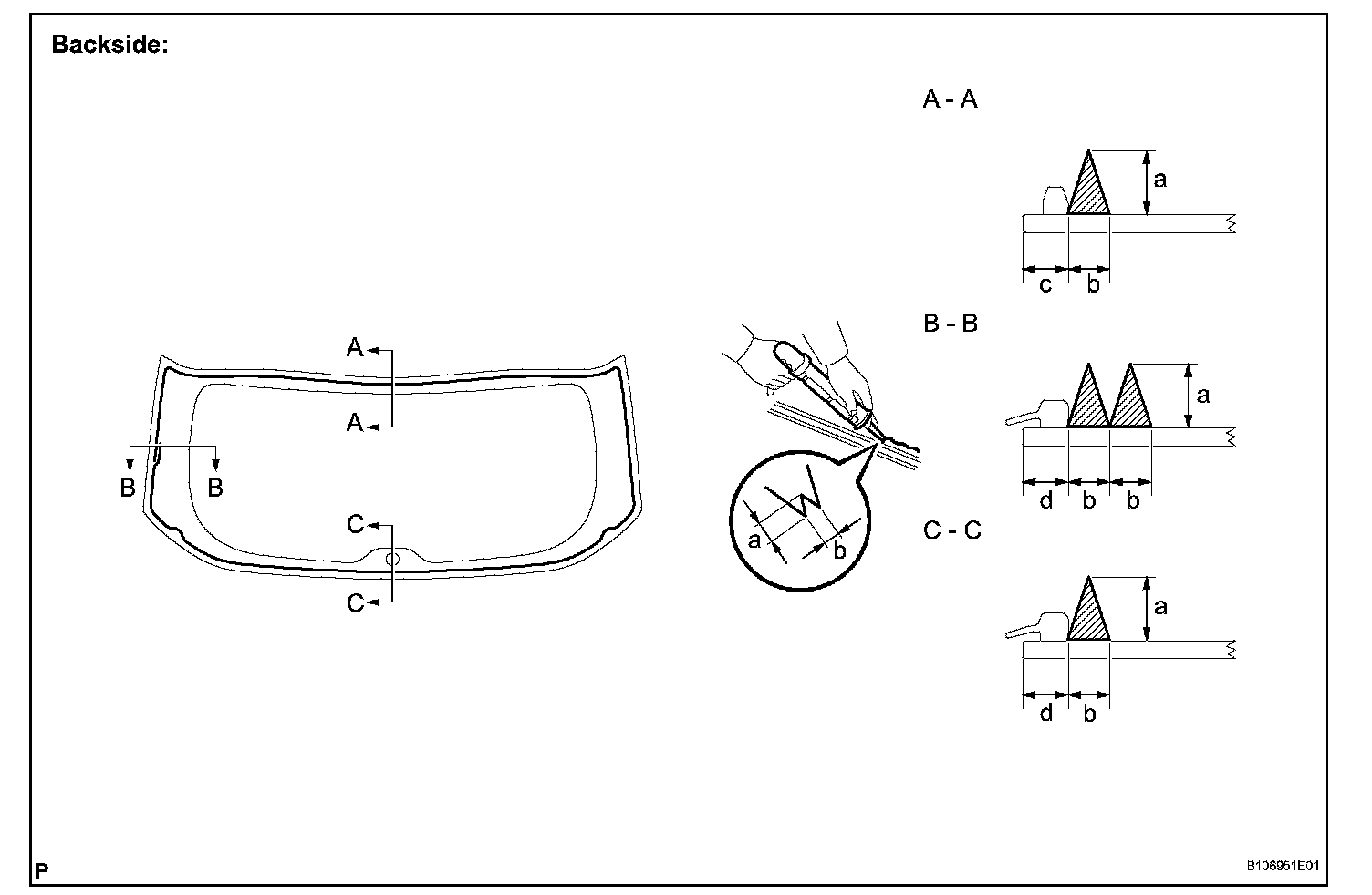 1. Hold the back window glass in place securely with tape or equivalent to the vehicle body until the adhesive has hardened.