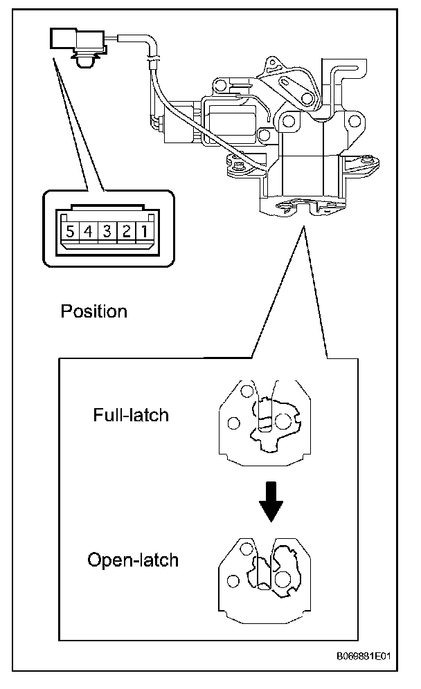 1. Full-latch: Connect the battery positive (+) lead to connector terminal 7 and the negative (-) lead to connector terminal 5.