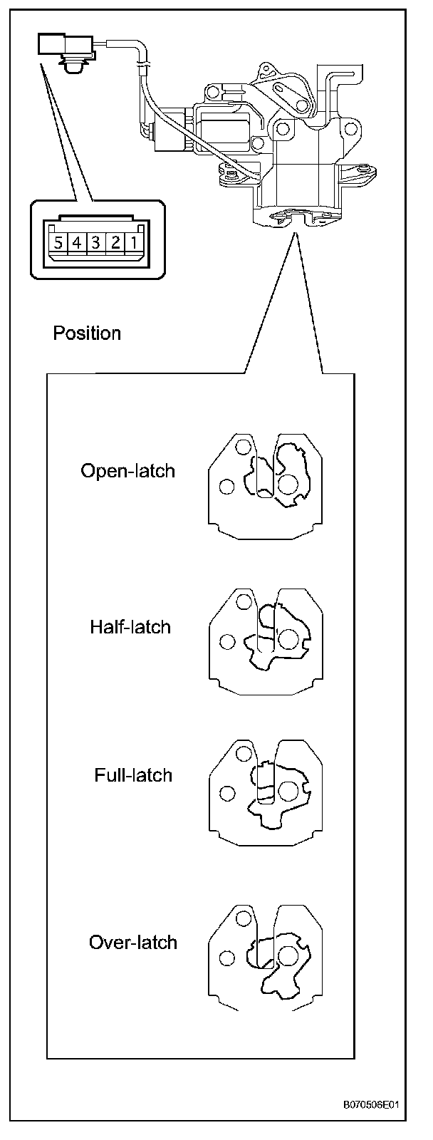 2. Over-latch: Connect the battery positive (+) lead to connector terminal 5 and the negative (-) lead to connector terminal 7.