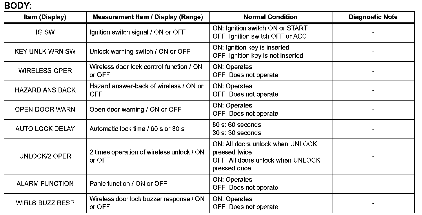 The wireless door lock control data list can be displayed while the intelligent tester is connected to the DLC3 with the ignition switch in the ON position. Follow the prompts on the tester screen to access the DATA LIST.