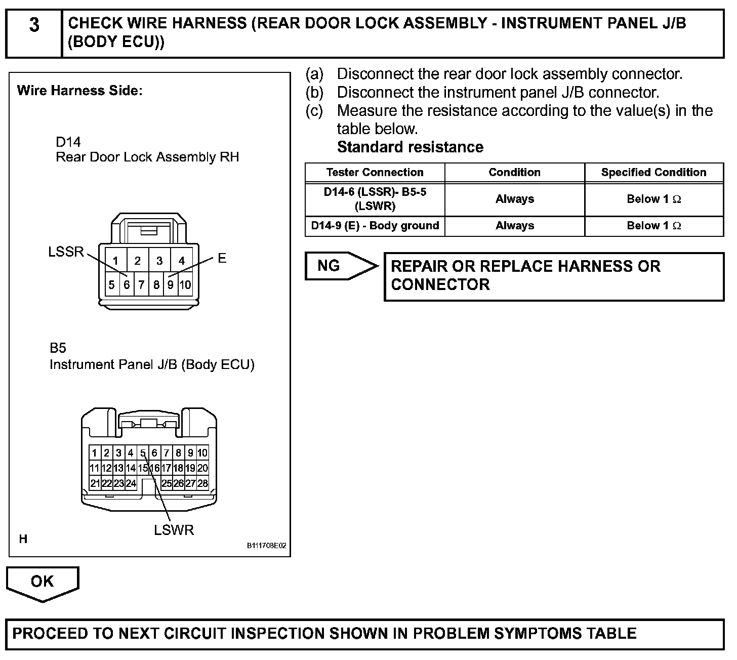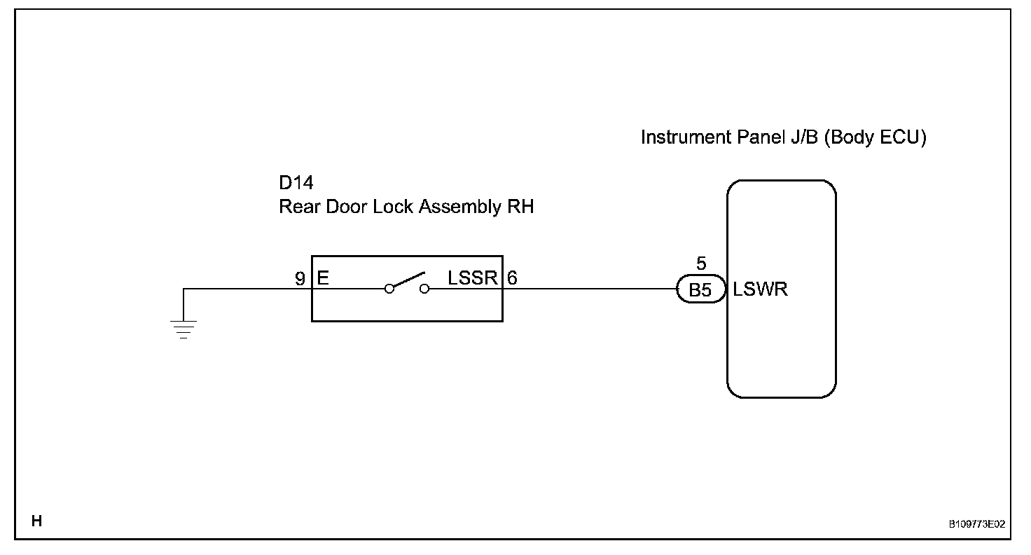 The body ECU is connected to the rear left side door lock assembly via terminal LSWR and rear left side door lock/unlock state signals are input to the ECU.