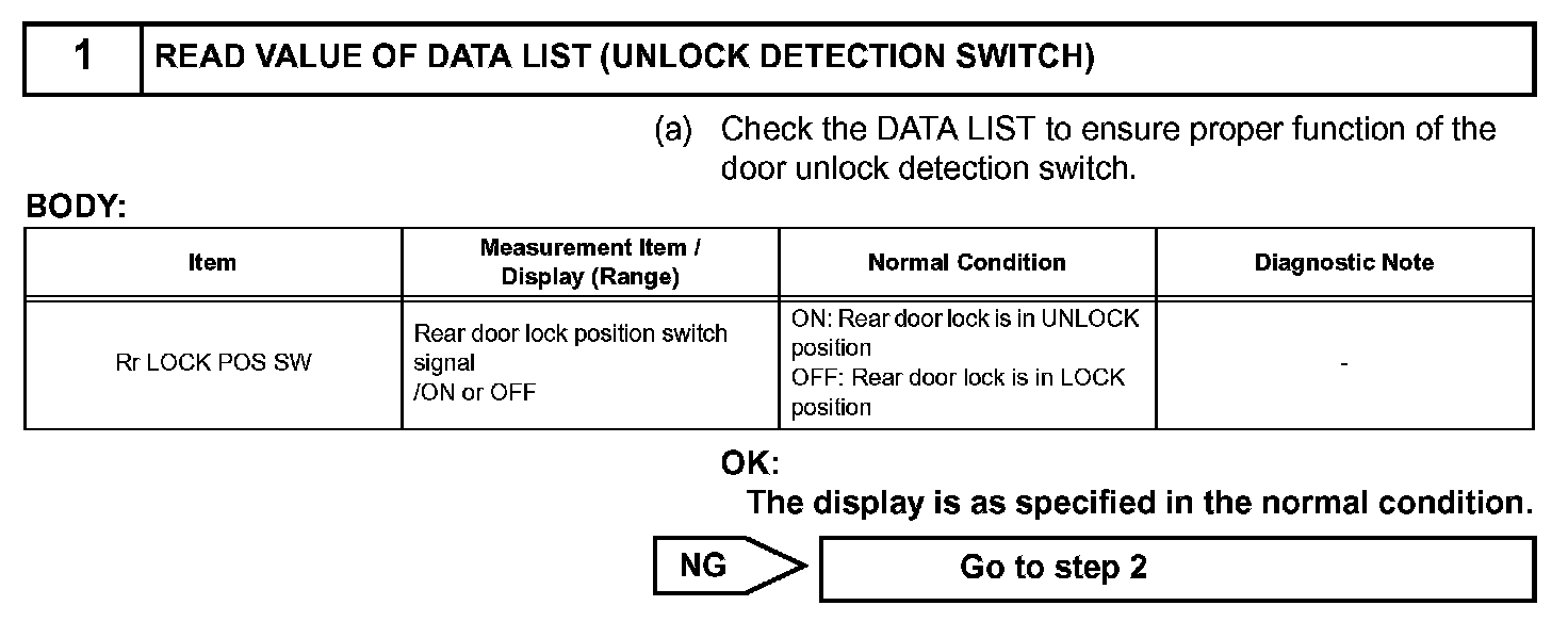 The body ECU applies voltage to the door unlock detection switch via terminal LSWR. When the door unlock detection switch is on (there is continuity between the switch terminals), a lock state signal is input to the ECU. When the switch is off (there is no continuity between the switch terminals), an unlock state signal is input.