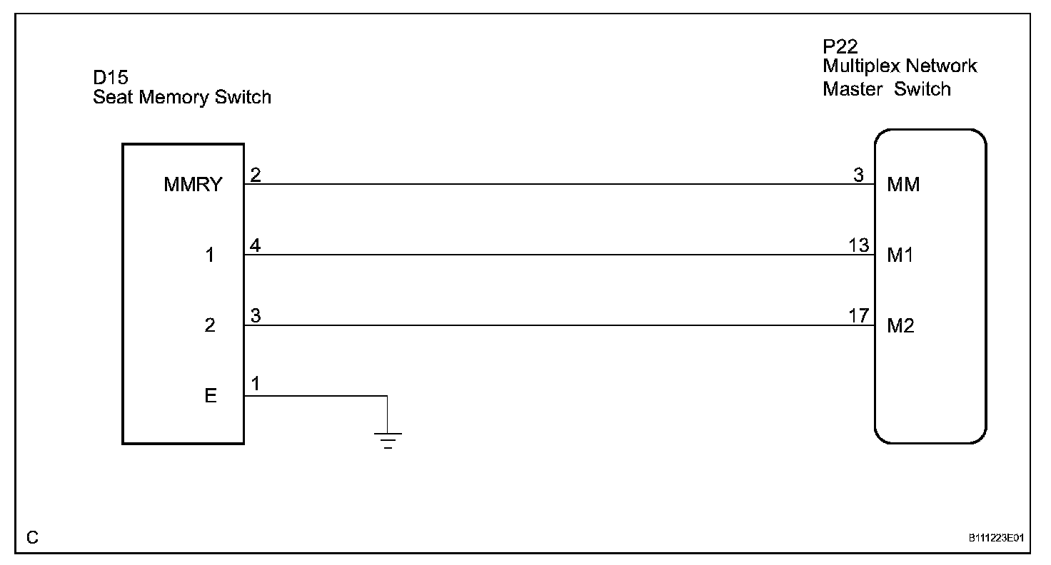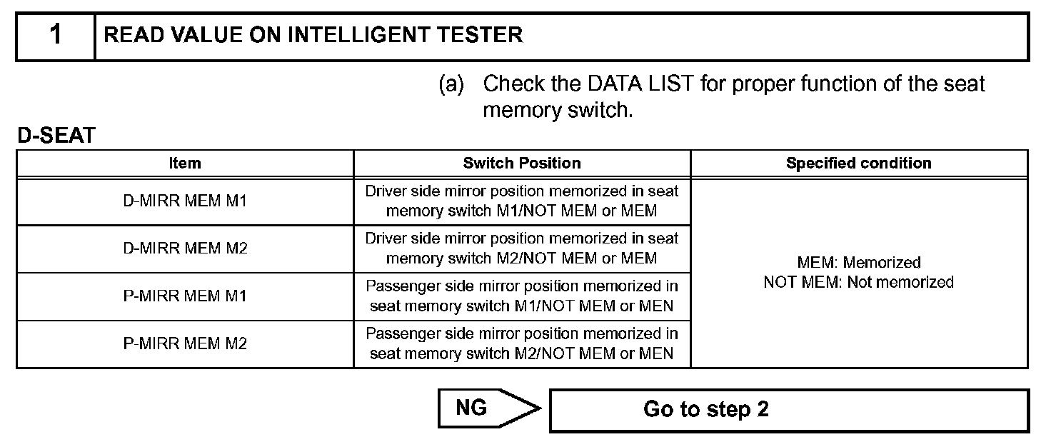 When the seat memory switch M1 or M2 is pressed, the position control ECU & switch (Seat ECU) transmits a signal of the memorized mirror position to the outer mirror control ECU by way of the power window regulator master switch. Then, the outer mirror control ECU drives the mirror motor.