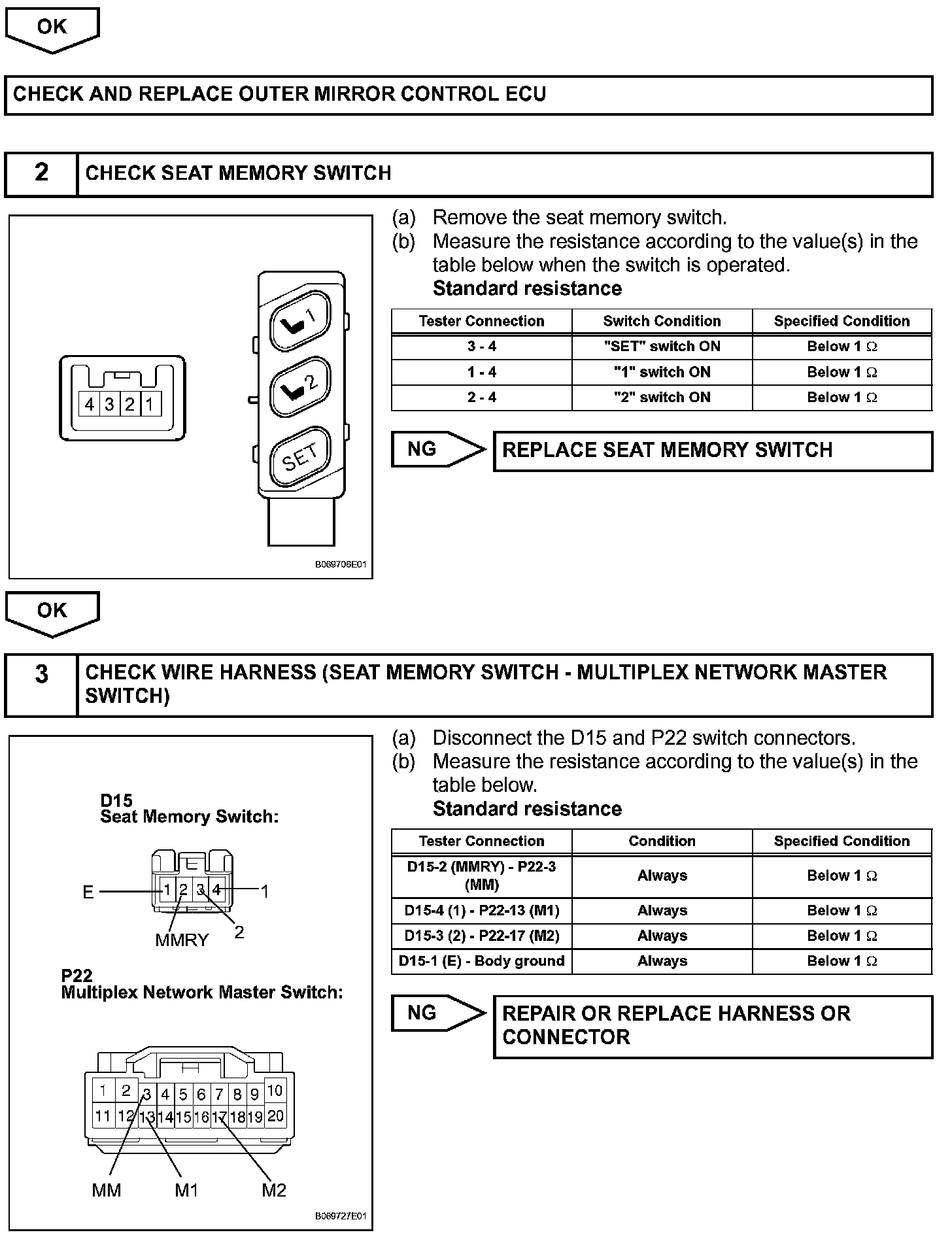 HINT: The power mirror control system is a part of the multiplex communication system. This system features shared communication wiring that reduces the wiring complexity of the communication lines. The first step in any repair is to confirm the proper operation of the communication system. Proceed with troubleshooting after the communication has been verified (See the Multiplex Communication System).