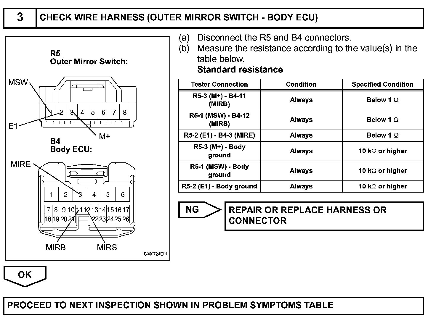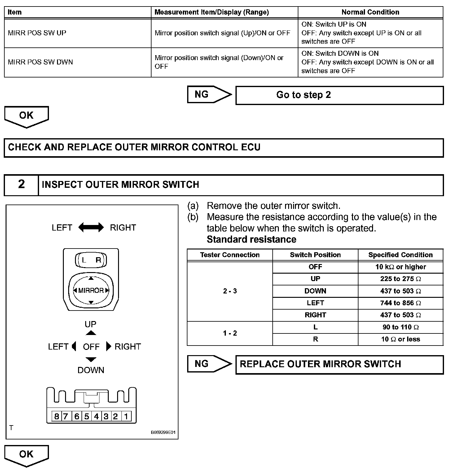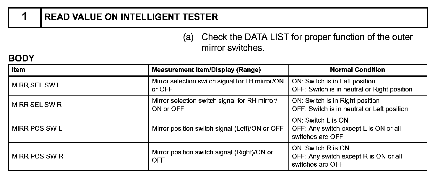 HINT: The power mirror control system is a part of the multiplex communication system. This system features shared communication wiring that reduces the wiring complexity of the communication lines. The first step in any repair is to confirm the proper operation of the communication system. Proceed with troubleshooting after the communication has been verified (See the Multiplex Communication System).