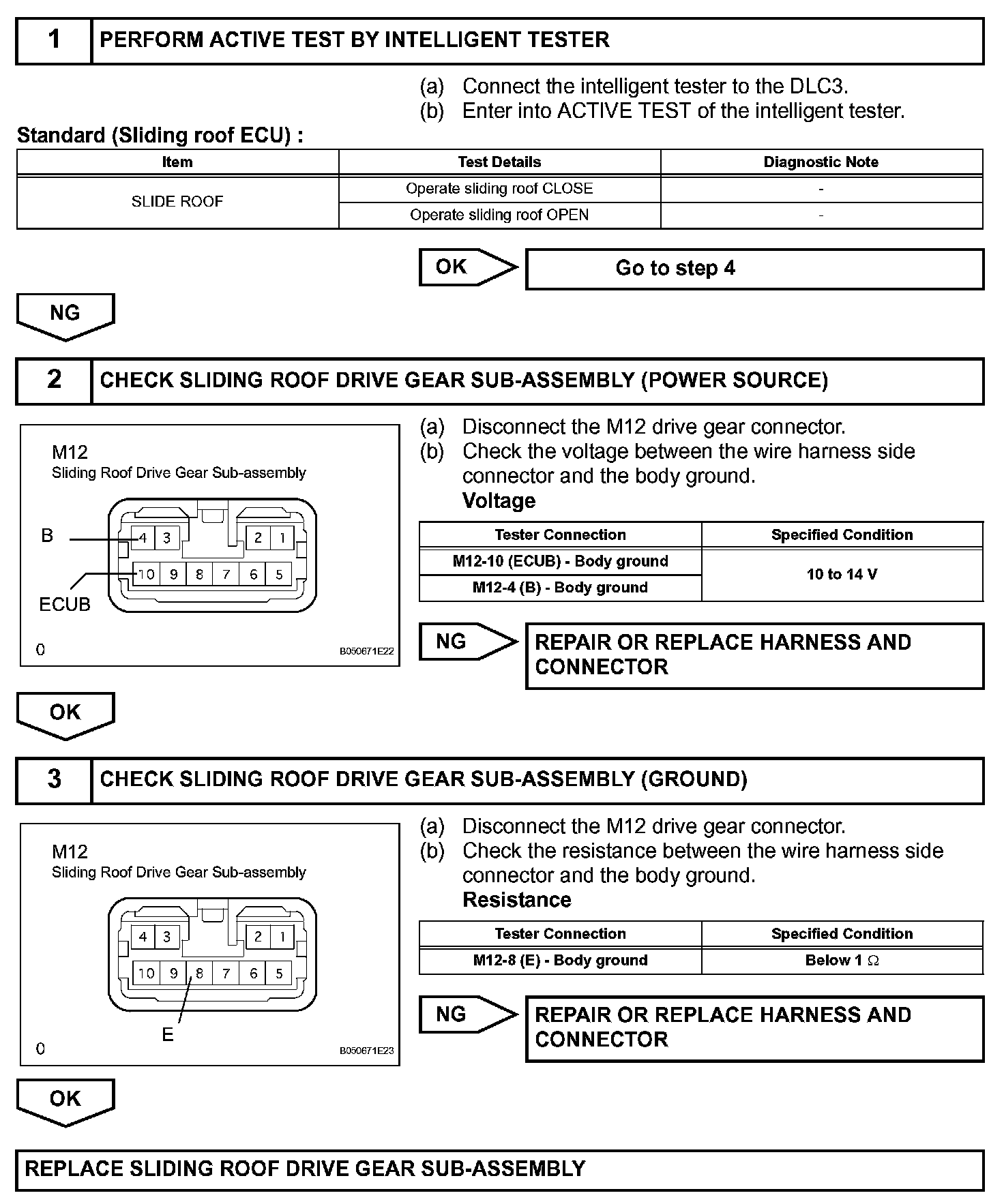 The sliding roof drive gear (Sliding roof ECU) monitors a sliding roof motor switch signal in line and the motor built in the sliding roof gear is driven.