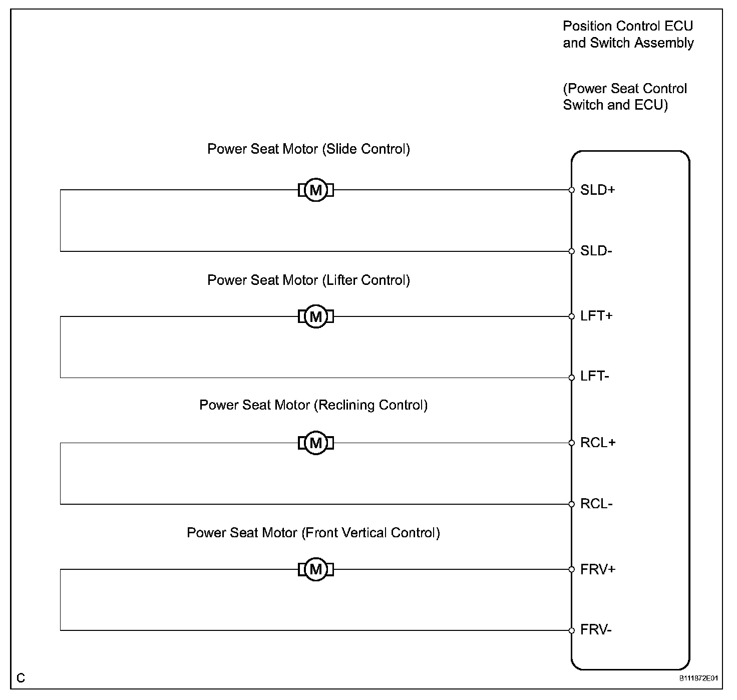 When the power seat control switch is operated, a command signal is sent to the position control ECU and switch assembly (power seat control switch and ECU). The front power seat switch then controls the appropriate seat motor as needed. This memory system does not use a seat position sensor. The seat position is detected by counting pulses that are output when the motor turns. If there is no pulse output from the motor, the motor will stop operating. The position control ECU and switch assembly (power seat control switch and ECU) is designed so that any malfunction of the seat memory system will not interfere with manual seat control.