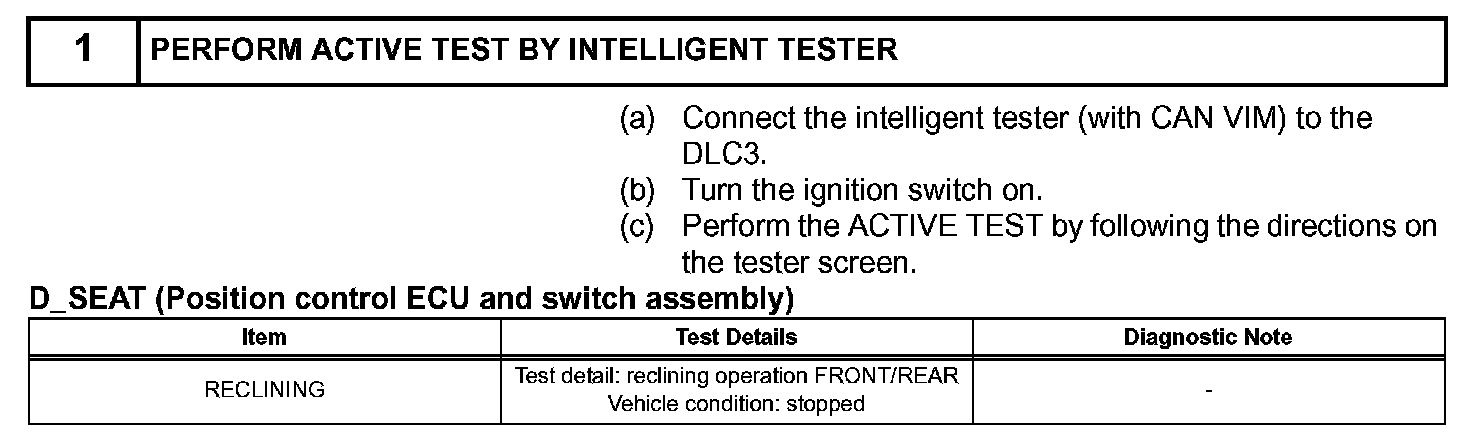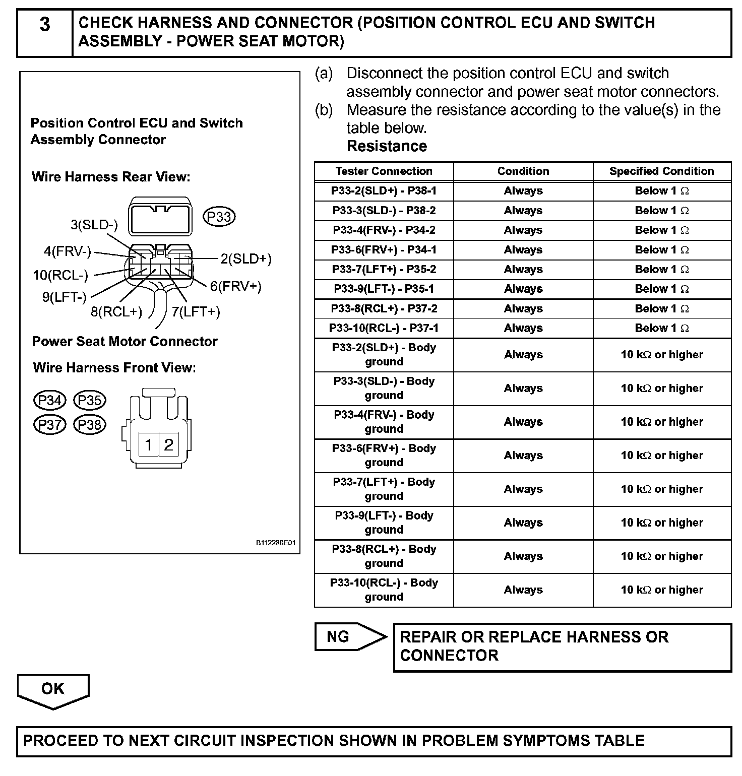 If the position control ECU and switch assembly (power seat control switch and ECU) detects a low motor speed, abnormal activity, or sudden motor current fluctuation, the system will stop the motor. If the motor operates continuously for 120 seconds or more, the system will stop the motor until the switch is turned on again.