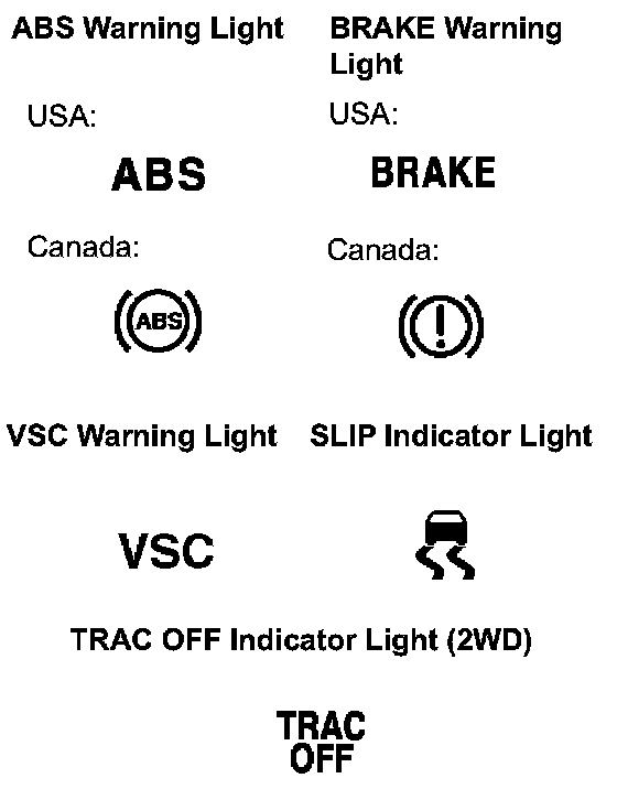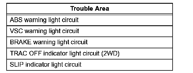 ^ If the ECU has any stored DTCs, the ABS warning light, VSC warning light and TRAC OFF indicator light (2WD) comes on.