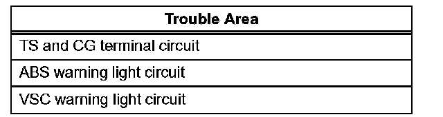 If the ABS warning light and VSC warning light do not blink, inspect the TS and CG terminal circuit, ABS warning light circuit and / or warning light circuit.