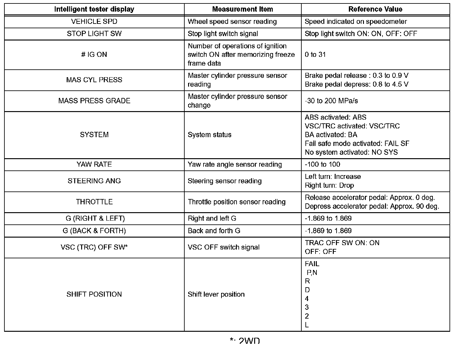 a. The vehicle (sensor) status, stored during ABS and or VSC operation or at the time of an error code detection, can be displayed by the intelligent tester.