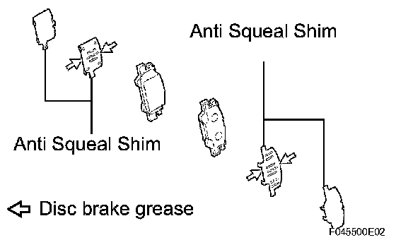 a. Apply disc brake grease to the inside of the anti squeal shims and install them and the pad wear indicators to each of the 2 brake pads.