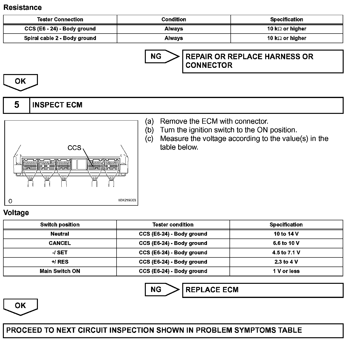 The cruise control main switch operates 7 functions: SET, COAST, TAP-DOWN, RESUME, ACCEL, TAPUP, and CANCEL. The SET, TAP-DOWN and COAST functions, and the RESUME, TAP-UP and ACCEL functions are operated with the same switch. The cruise control main switch is an automatic return type switch which turns on only while operating it in each arrow direction and turns off after releasing it. The internal contact point of the cruise control main switch is turned on with the switch operation. Then the ECM reads the resistance value that has been changed by the switch operation to control SET, COAST, RESUME, ACCEL and CANCEL.