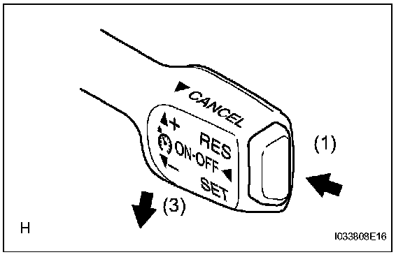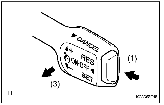 4. Check that vehicle speed increases while the cruise control main switch is pushed to +/RES, and that the vehicle cruises at the newly set speed when the switch is released.