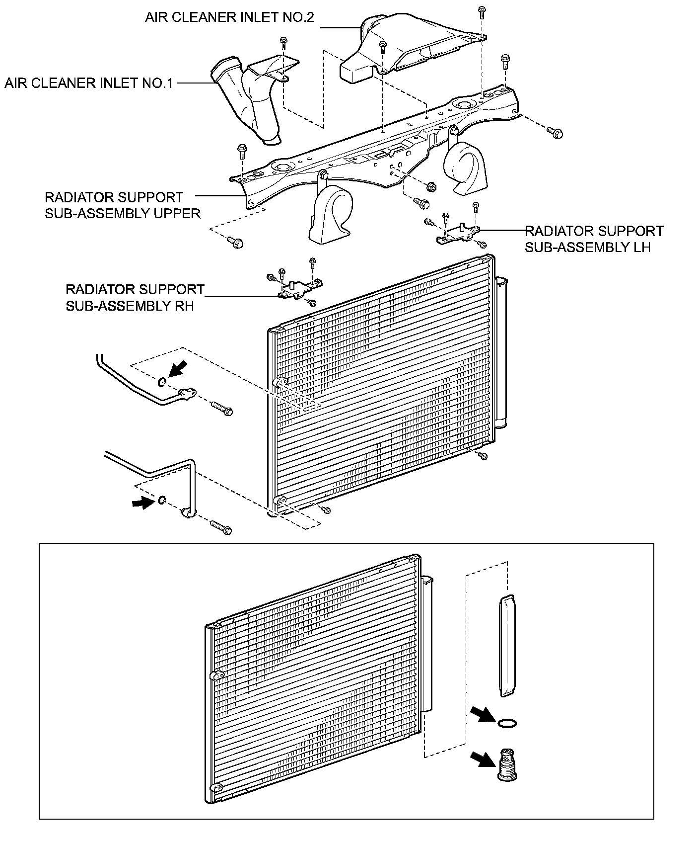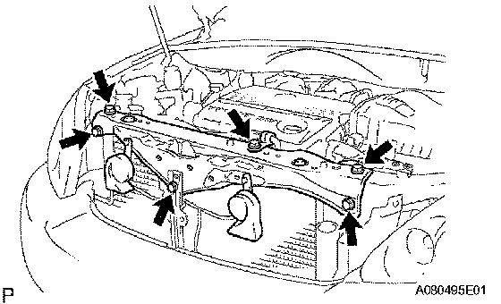 c. Remove the 5 bolts and the radiator upper support.