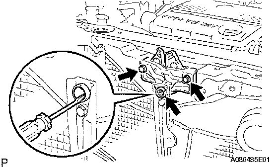 b. Remove the 2 bolts and nut, and separate the hood lock.