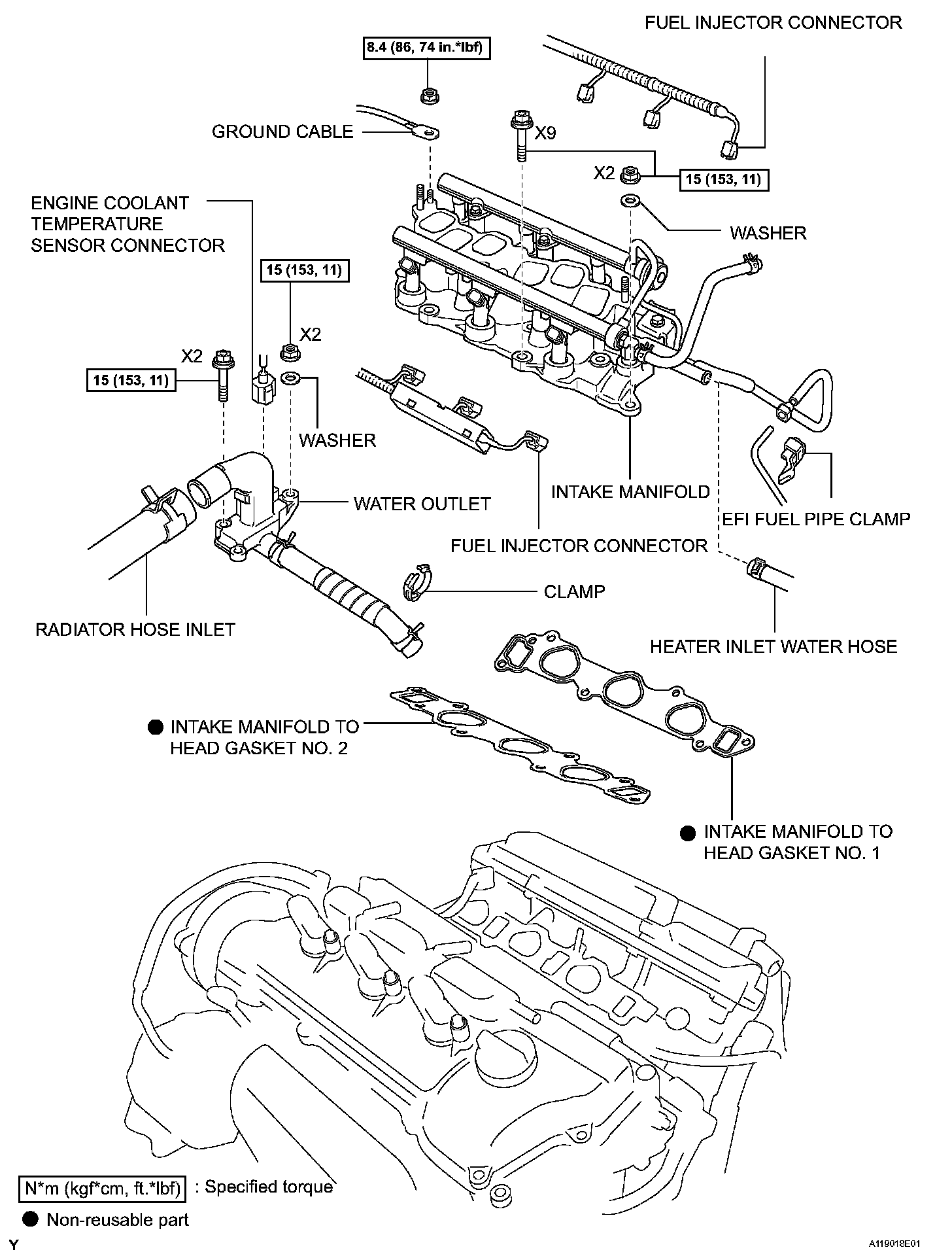 a. Install the intake manifold with the 9 bolts, 2 nuts and 2 washers. Using several steps, tighten the bolts and nuts uniformly in the sequence shown in the illustration.
