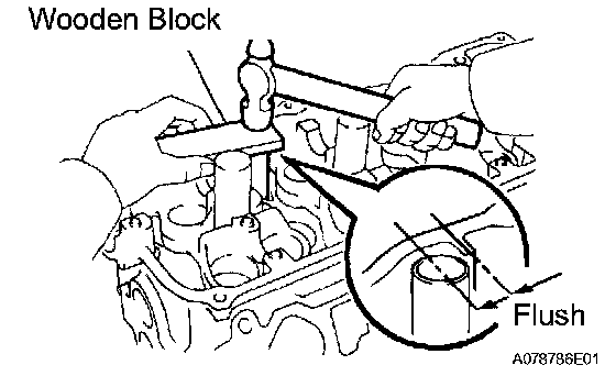 a. Using a wooden block and hammer, tap in 2 new PCV pipes until its top edge is flush with the cylinder head edge (RH cylinder).