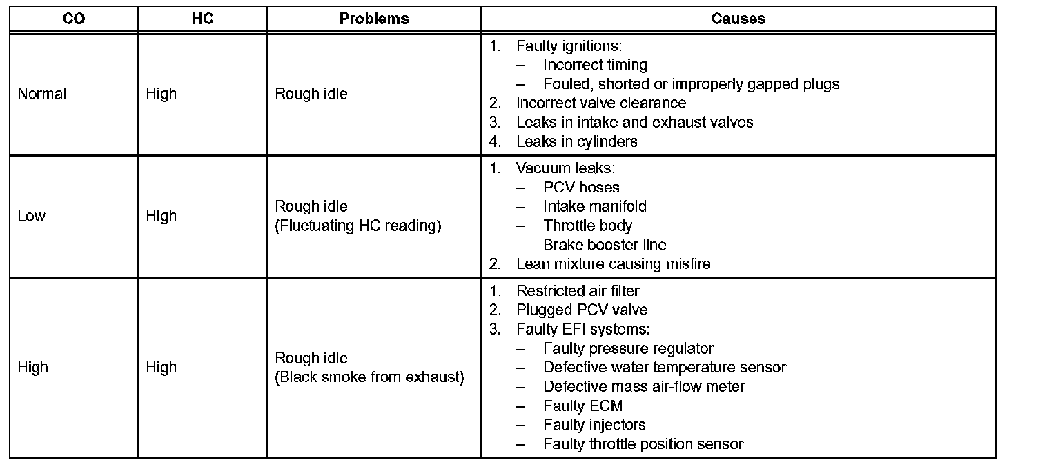 HINT: When doing the 2 mode (with the engine is in the idle and 2,500 rpm) test, these measuring order are prescribed by the applicable local regulations. If the CO/HC concentration does not comply with regulations, troubleshoot in this order.