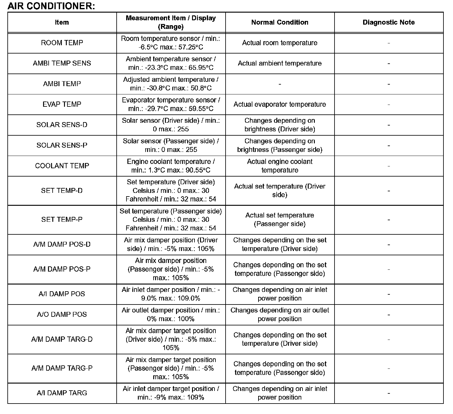 c. Enter the following menus: DIAGNOSIS / OBD/ MOBD / AIR CONDITIONER / DATA LIST.