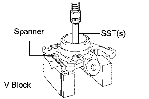 c. Using a spanner to make the steering knuckle LH horizontal, fix it to the V block, as shown in the illustration.