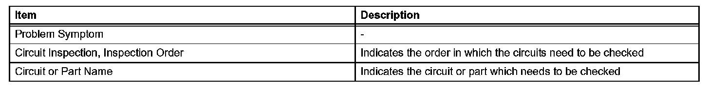PROBLEM SYMPTOMS TABLEWhen a "Normal" code is output during a DTC check but the problem still occurs, use the Problem Symptoms Table. The suspected areas (circuits or parts) for each problem symptoms are in the table. The suspected areas are listed in order of probability. A description of each of the chart's columns is shown in the table given.