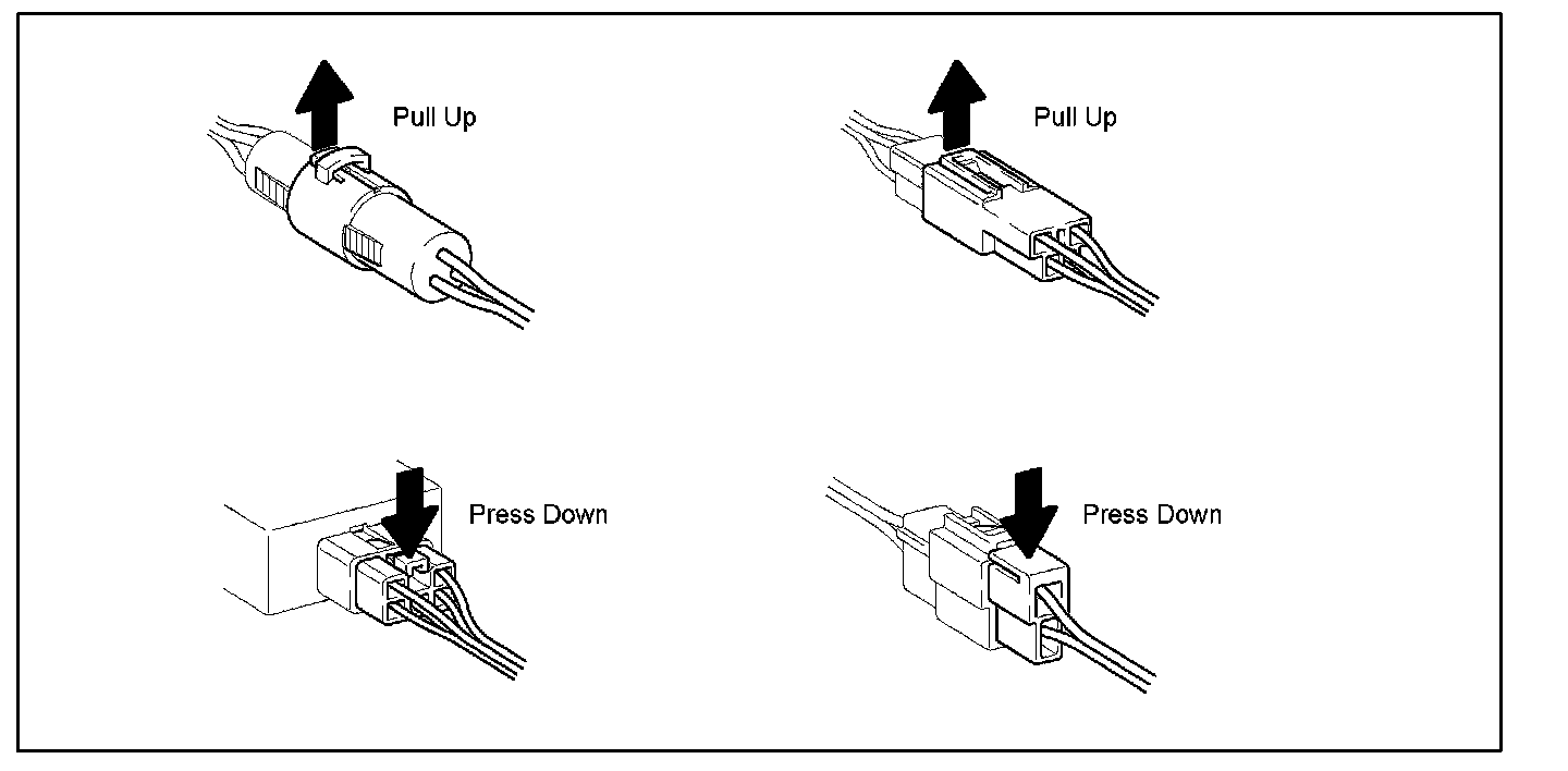 DISCONNECTION OF MALE AND FEMALE CONNECTORSTo pull apart the connectors, pull on the connector itself, not the wire harness.