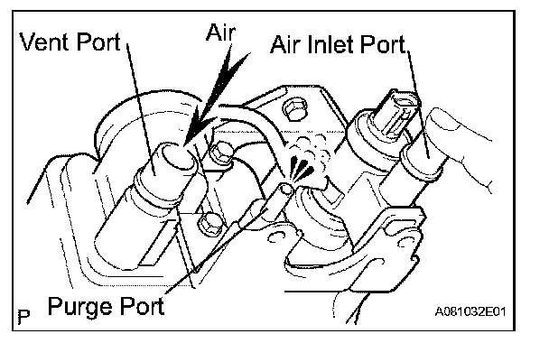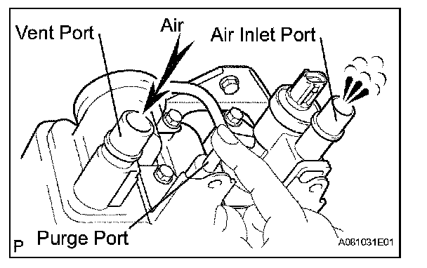 1. While holding the purge port closed, blow air (0.39 kPa, 4.0 gf/sq.cm, 0.06 psi) into the vent port, and check that air flows from the air inlet port.