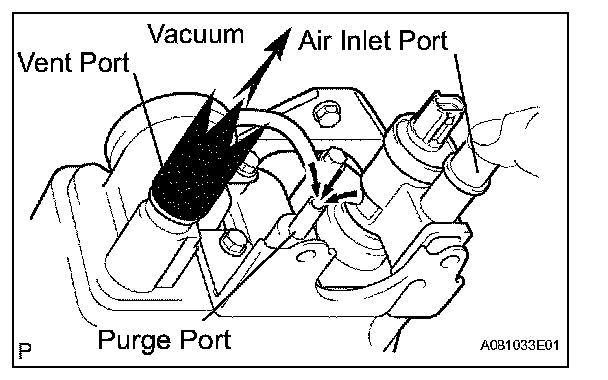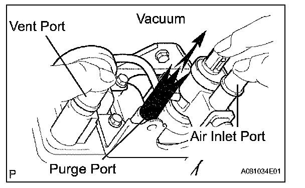3. While holding the air inlet closed, apply vacuum (3.43 kPa, 25.7 gf/sq.cm, 1.01 psi) to the vent port, and check that air is sucked in from the purge port. If operation is not as specified, replace the charcoal canister.