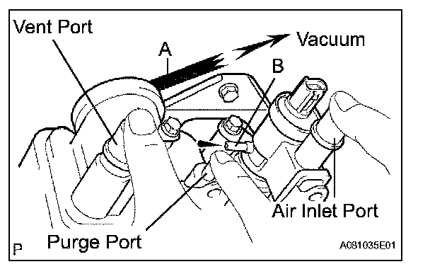 2. While holding the vent, purge and air inlet ports closed, apply vacuum (1.42 kPa, 11 mmHg, 0.42 in.Hg) into port A, and check that air is sucked in from port B.