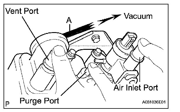1. While holding the vent and air inlet ports closed, apply vacuum (3.43 kPa, 25.7 gf/sq.cm, 1.01 psi) to the purge port, and check that the vacuum is maintained for 1 minute.