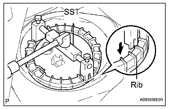 HINT: A rib on the fuel pump gauge retainer can be fitted into a tip of the SST. c.Remove the fuel pump gauge retainer.