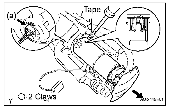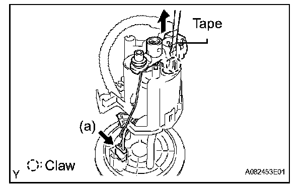 b. Using a small screwdriver with the tip wrapped in tape, disconnect the 2 snap-claws from the claw holes and pull out the fuel pump.