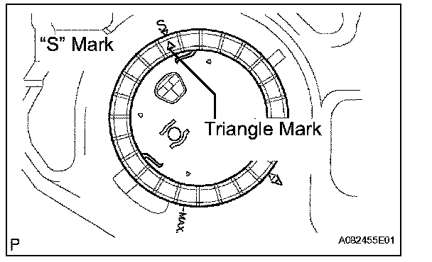 d. Align the triangle mark on new fuel pump gauge retainer with the "S" mark on the fuel tank while pushing down the fuel suction tube w/ pump & gage, attach the fuel pump gauge retainer.