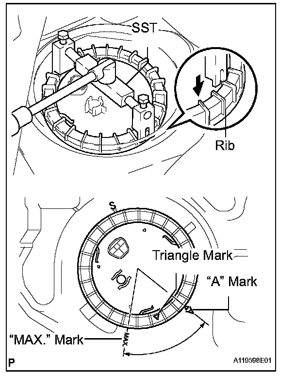e. Rotate the fuel pump gauge retainer by hand, then tighten it one complete turn and half using SST. Triangle mark on the fuel pump gauge retainer must be positioned between "A" and "MAX." indications on the fuel tank.