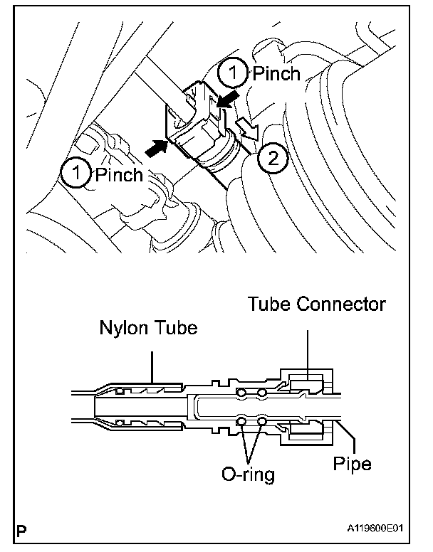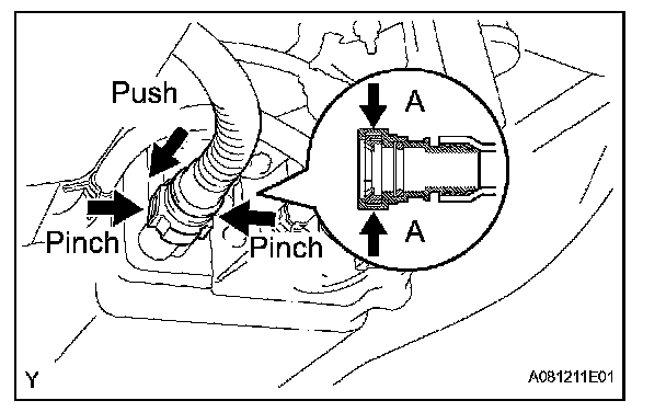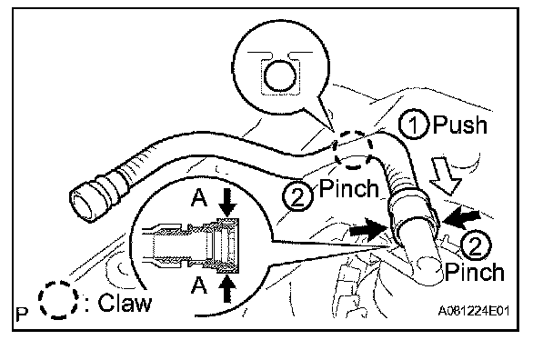 1. Pinch the tube connector and then pull out the fuel tank breather tube No. 3.