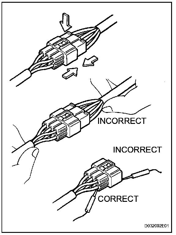 1. When disconnecting a connector, first squeeze the mating connector housing halves tightly together to release the lock, and then press the lock claw and separate the connector.