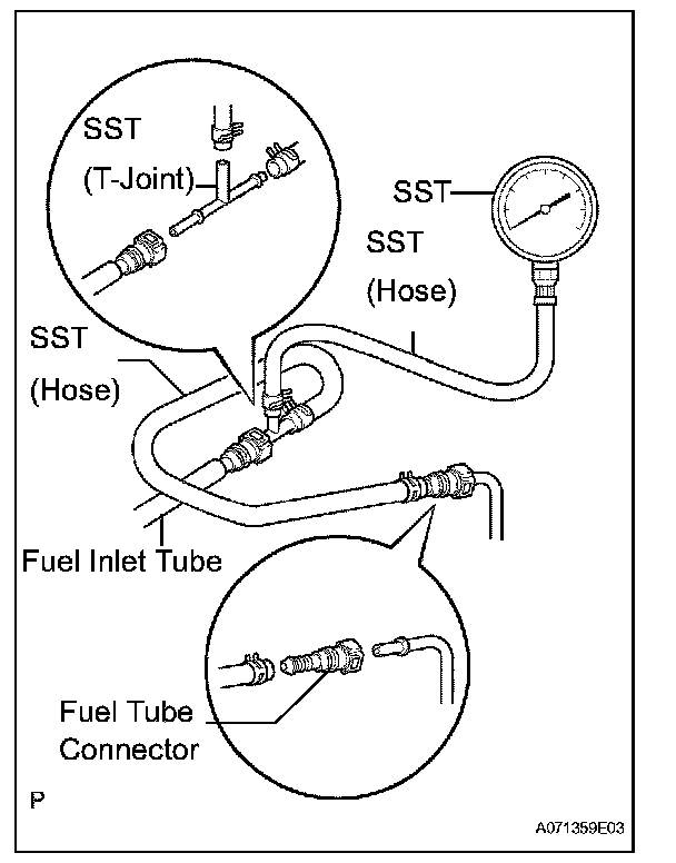 g. Install SST (pressure gauge) and fuel tube connector using SST as shown in the illustration.