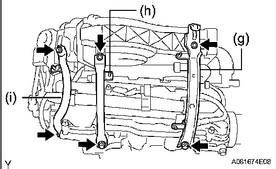 h. Remove the 2 bolts, then remove the surge tank stay No. 1.