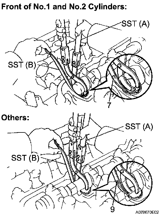 c. Using SST (A), press down the valve lifter and place SST (B) between the camshaft and valve lifter. Remove SST (A).