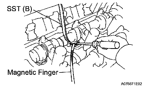 i. Press down the valve lifter with SST (A), and remove SST (B).