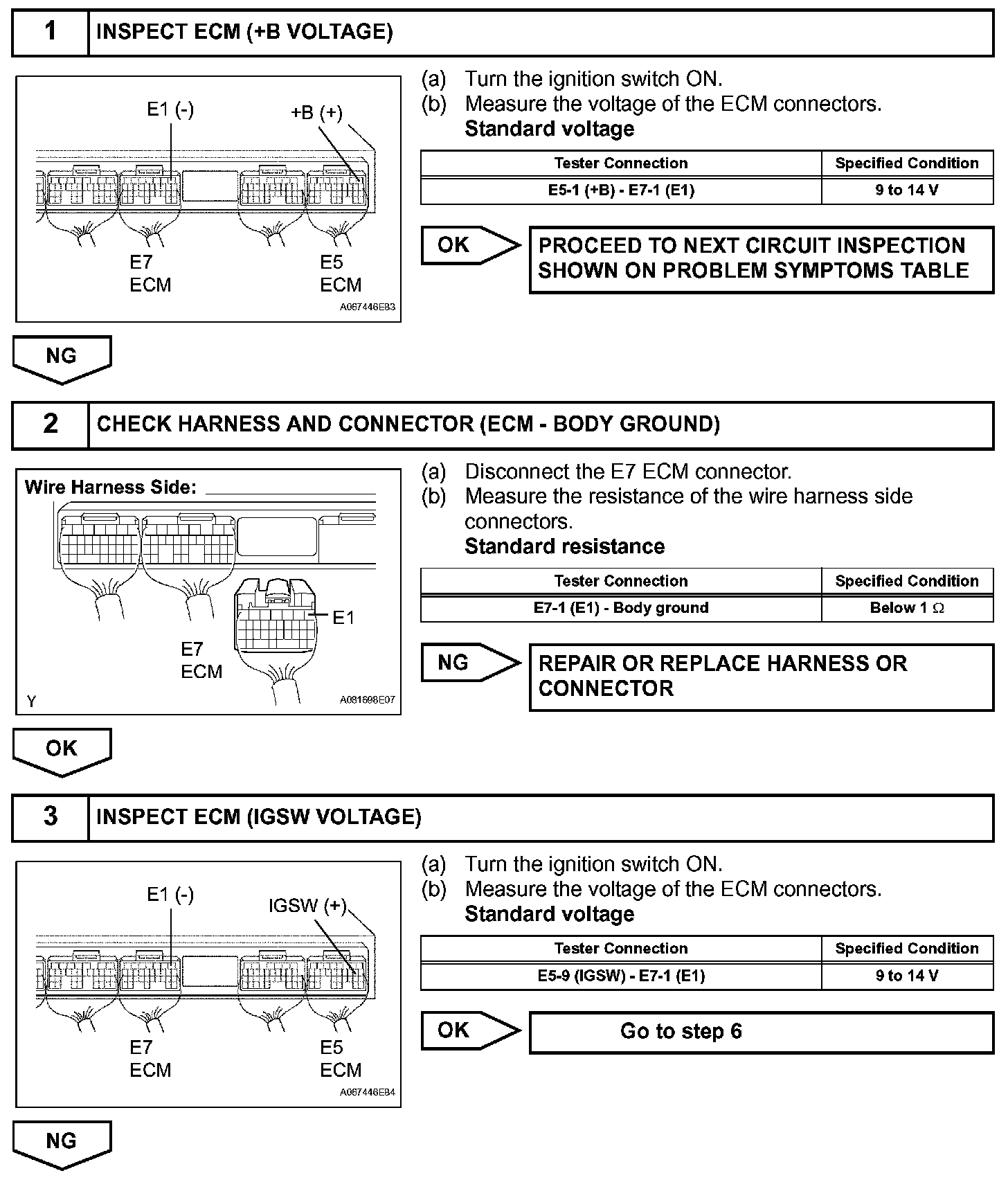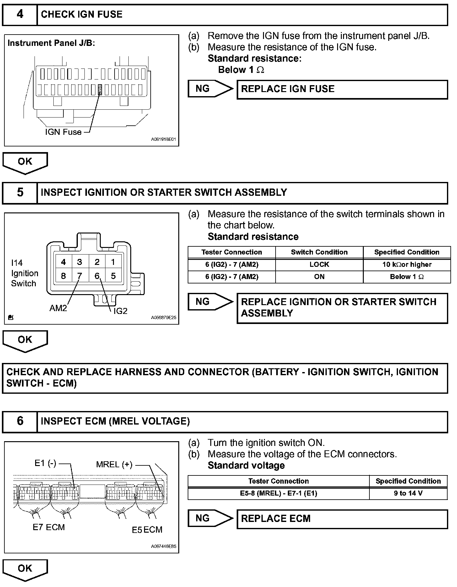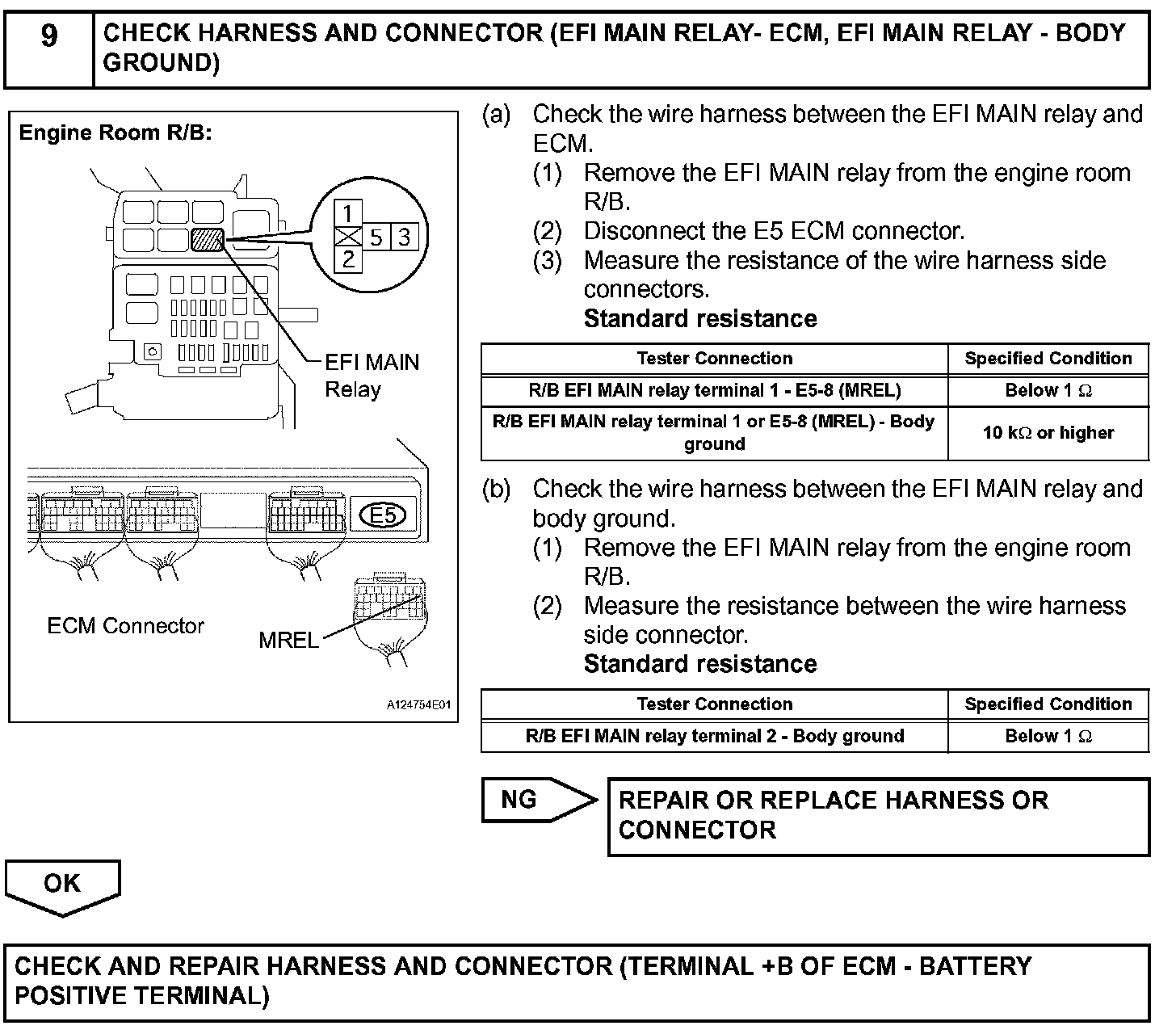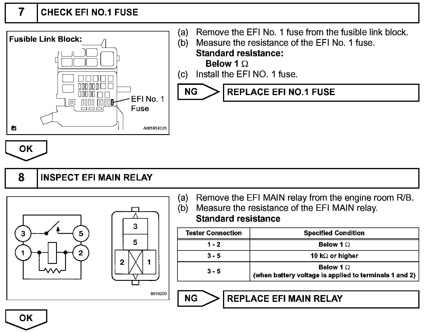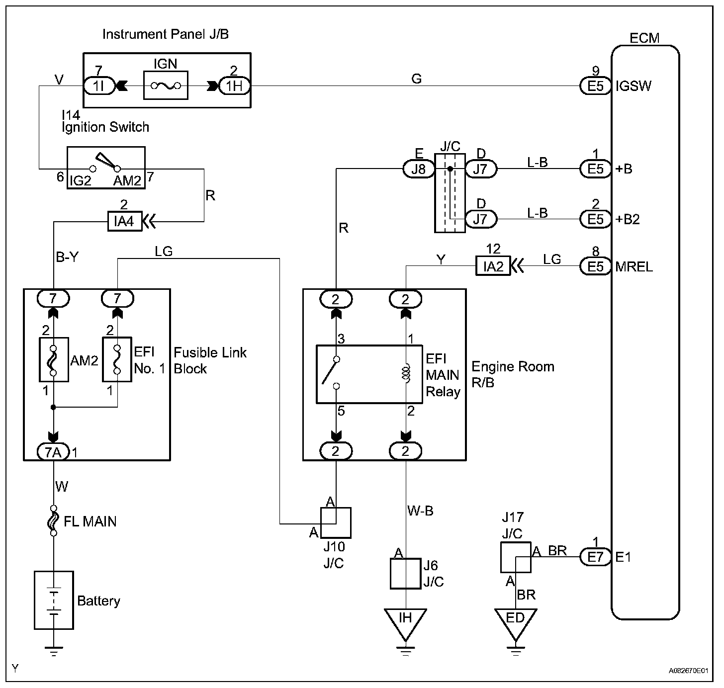 When the ignition switch is turned ON, battery voltage is applied to terminal IGSW of the ECM. The ECM "MREL" output signal causes current to flow to the coil, closing the contacts of the EFI relay (marked: EFI) and supplying power to terminal +B of the ECM.