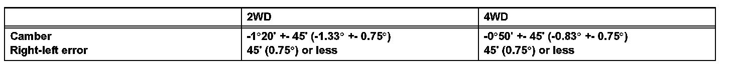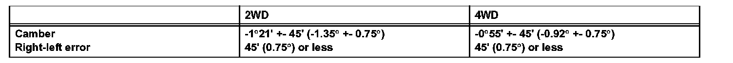 HINT: Camber is not adjustable. If the measurement is not within the specification, inspect the suspension parts for damage and/or wear, and replace them if necessary.