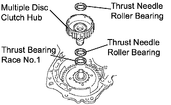 a. Remove the thrust needle roller bearing, multiple disc clutch hub, thrust needle roller bearing and thrust bearing race No.1 from the transaxle case.