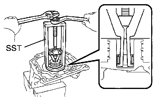 ^ Stop the press when the spring seat is lowered 1 to 2 mm (0.039 to 0.078 inch) from the snap ring groove, to prevent the spring seat from being deformed.