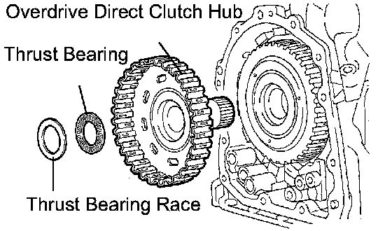a. Remove the thrust bearing race, thrust bearing and overdrive direct clutch hub from the planetary gear assembly.