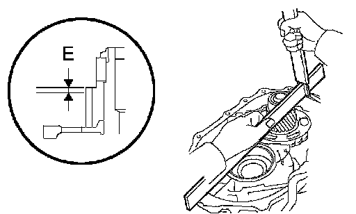 d. Using a straightedge and vernier calipers as shown in the illustration, measure the gap between the top of the differential drive pinion in the underdrive planetary gear and the contact surface of the transaxle case and housing (Dimension E).