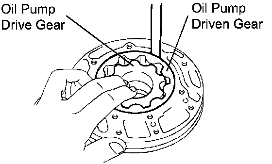c. Using a feeler gauge, measure the tip clearance between the driven gear teeth and drive gear teeth.